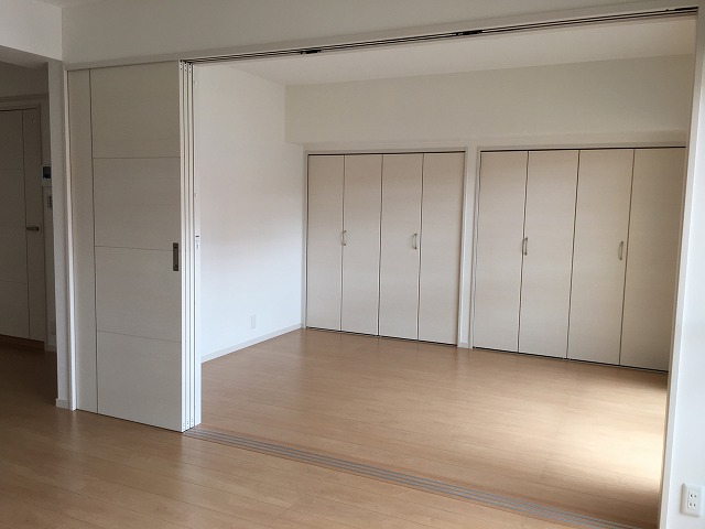 大規模リノベーションのご依頼をいただきました。 間取りはもともと4DKでしたが、和室とDKをつなげて3LDKに改装し、床フローリング貼替、天井壁クロス貼替、水廻り設備品交換をおこないました。 床や建具をナチュラル~ホワイト系でそろえたので明るく開放感ある部屋になっています。